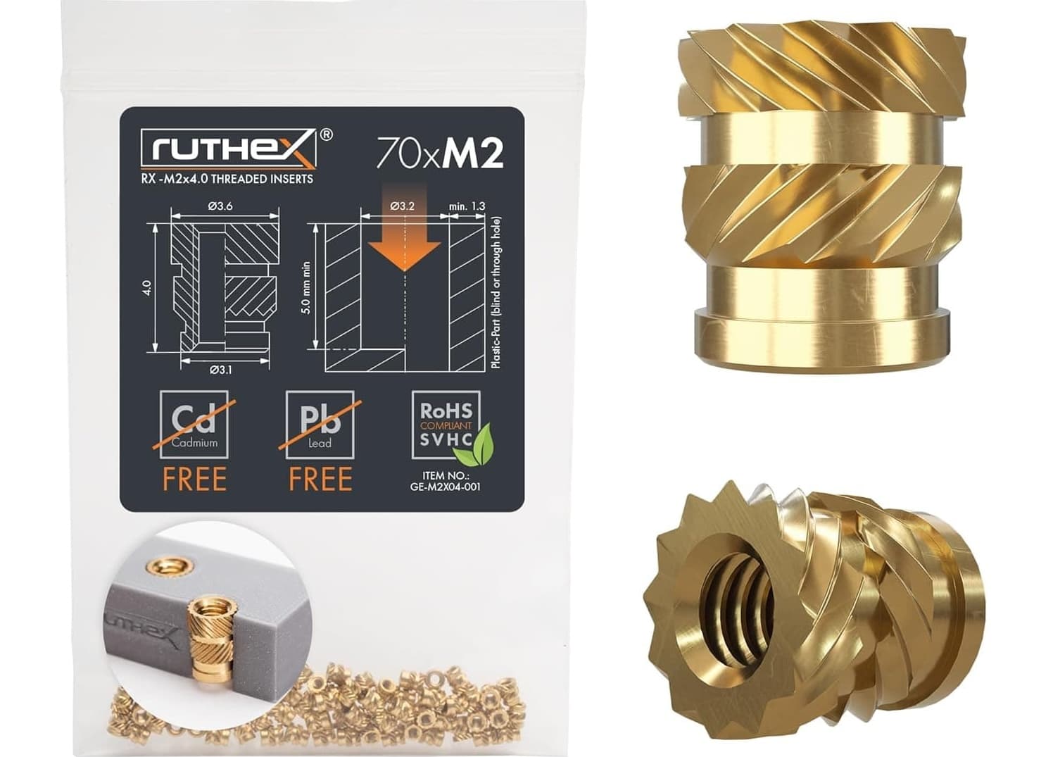 There are some special Tracks like the Marble Pump that call for the use of M2 brass threaded inserts. There are number of different sizes and types of M2 Brass threaded inserts available but the size and shape you will need for the Marble Pump and all other Tracks that call for Heatset Inserts is 3.6mm OD x 4mm length. Make sure to find inserts with a spiral profile like in the image below instead of straight teeth. Inserts with straight teeth (look like tiny little spur gears) are designed for use in injection molds and are not as strong when applied to 3D prints.
